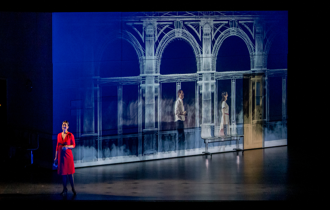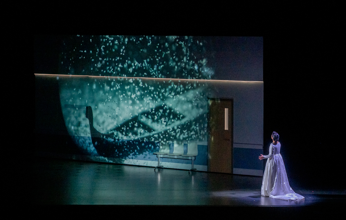 C'è poi una Caterina contemporanea, in rosso, incinta (ed effettivamente la Caterina storica divenne madre, anche se per poco, ed era incinta al momento della morte di Lusignano), novella orfana di padre, afflitta per il destino del marito ricoverato, affetto da lunga malattia. Il marito, attossicato da Mocenigo, è naturalmente Lusignano, che si alza e si corica su una lettiga in una corsia d'ospedale, camicione blu d'ordinanza dei degenti – concorrono qui i camici bianchi, i referti, le radiografie, i veloci consulti in corsia, i «non ho tempo» mimati dei medici ai quali Caterina chiede invano informazioni. Per inciso, le scene di Matteo Paoletti Franzato risultano funzionali nello sfruttare una struttura rotante e scomponibile, volta a volta corridoio di una clinica – freddo, spoglio e un po' in penombra –, corsia di reparto, luoghi storici di Venezia e di Cipro scorciati in strutture architettoniche classicheggianti... Basta questa struttura a soddisfare pressoché tutte le esigenze sceniche, esempio ben riuscito di economia di mezzi e pragmatismo. Certo, Lusignano-paziente che viene rivestito del manto suo regal da un infermiere e diventa Lusignano-re fa un po' ridere – pardon, deconcentra dall'esperienza immedesimata di ascolto –, così come i sicari in mascherina nera, retaggio di pandemica memoria…