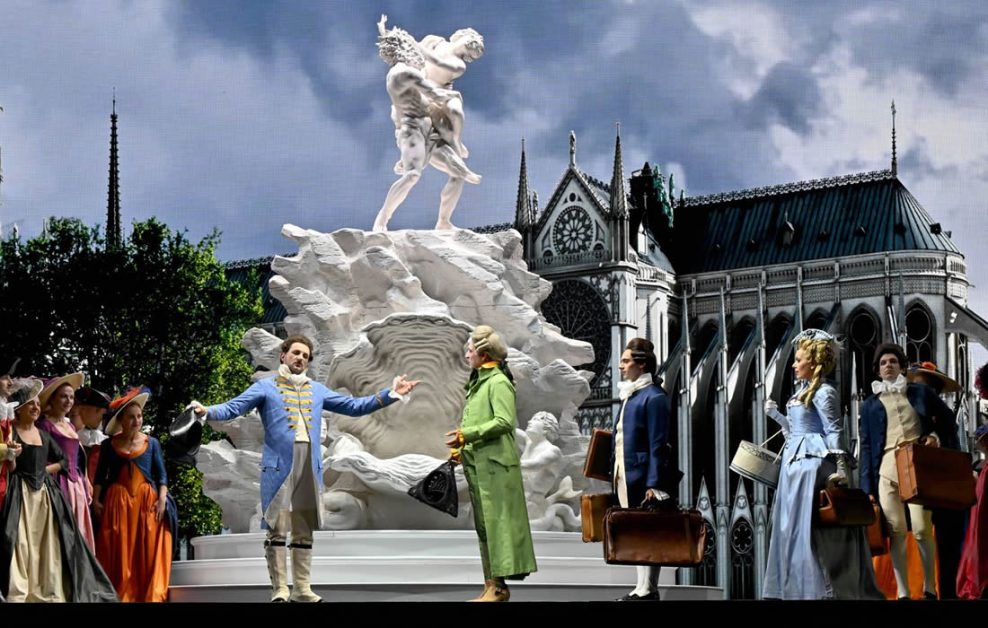 Manon Lescaut mancava in questo Teatro dal dicembre del 2005. Per la sua ripresa si è optato per l'allestimento presentato al Festival di Torre del Lago nel 2024, debitamente adattato per la piazza parmigiana. Regia, scene, costumi e luci sono a cura di Massimo Pizzi Gasparon Contarini. L'idea sembra essere quella di restare fedeli al libretto e alla sceneggiatura, innestando però la tecnologia a servizio dello spettacolo. E potrebbe anche funzionare, al netto di scelte ben poco e in alcuni casi punto condivisibili sulla grafica del progetto. Tutto è improntato a una violenza di colori pari solo alla violenza delle passioni portate in scena: i costumi sono sì adeguati al Settecento, ma soprattutto quelli delle comparse e di alcuni comprimari sgargianti, macchie di colore fin troppo vivide. Non da meno è la fontana marmorea che campeggia al centro della scena ad apertura di sipario, bianchissima e vaporosa come panna montata, sul lato destro della cattedrale di Amiens riprodotta, col cielo azzurro intenso, sul ledwall al fondo. «Il ciel s'infosca» verso la fine dell'atto, la fontana ruota diventando il letto di Manon e, senza intervallo, senza chiusura di sipario, coi tavolini laterali che francamente sembrano quelli dell'Ikea rimossi a mano dai tecnici di palcoscenico, ci troviamo nel palazzo di Geronte, opulente di marmi anche qui d'un bianco-grigio fin troppo sgargiante. Significativamente, il cielo torna ad adombrarsi di nuvole alla ricomparsa di Des Grieux, come a dire che le cose stanno per prendere una brutta piega. L'intervallo arriva a fine secondo atto, e al rientro ci si aspetterebbe l'Intermezzo. No: si va lisci col terzo, l'Intermezzo venendo spostato all'inizio del quarto. Ci torniamo. Prima, vediamo come è reso il porto di Le Havre: gabbie da animali ai lati, molto più moderne per l'epoca come i tavolini di cui sopra, racchiudono le prostitute, che con una certa monotonia devono, tutte spettinate e conciate come certi personaggi di Helena Bonham Carter, provocare il Sergente con moine o gesti osceni – una certa rigidità d'impostazione nel far muovere i personaggi è del resto riscontrabile anche negli altri atti: comparse quasi sempre speculari, gestualità poco coerenti, come il palleggiare dei gioielli da parte di Manon al second'atto, mentre tutto attorno a lei è fretta e frenesia. Dall'orizzonte del mare sul ledwall giunge, ingrandendosi sempre più e infine attraccando al pontile, il vascello su cui Des Grieux, Manon e le altre ragazze salperanno: una grafica che ha portato più d'un commentatore a evocare realtà videoludiche, con più o meno pertinenza, assieme al deserto della Louisiana reso con vivide, abbacinanti campiture bruno-arancioni, sempre grazie al ledwall. L'idea, ripeto, potrebbe anche funzionare, ma tutta questa stucchevole artificiosità di colori e in alcuni casi di movimento porta alla lunga più a un estraniamento che non a un'immedesimazione, sortendo quindi l'effetto opposto di un, si diceva, pur lodevole proposito.