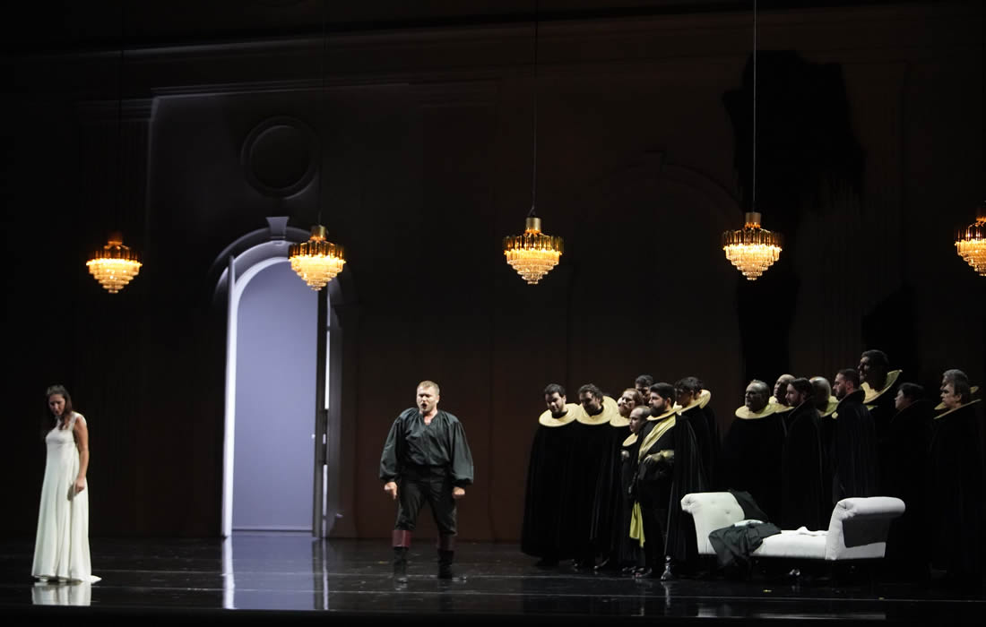 E partiamo quindi proprio dal Rigoletto andato in scena mercoledì 5 novembre 2025, prima delle tre seconde date del progetto. Come si diceva, cast, regia e direzione sono (quasi) gli stessi per i tre titoli. La regia è affidata a Roberto Catalano, che si avvale delle scene di Mariana Moreira, i costumi di Veronica Pattuelli, le luci di Silvia Vacca e le coreografie di Marco Caudera. L'ambientazione scelta da Catalano non ricalca pedissequamente le indicazioni librettistiche, ma se ne distacca con intelligenza, mantenendo aderenza allo spirito del libretto e proiettando la realtà drammaturgica in una dimensione sospesa, quasi idealizzata, con riferimenti sincretici a più epoche storiche, suggerite dai dettagli in scena, che di fatto non coincidono in pieno con nessuna epoca storica. Rigoletto, con l'immancabile gobba (che poi… immancabile… in alcuni Rigoletti manca eccome!), veste la giubba rossa del giullare, ma se ne libera nei momenti in cui la sua umanità emerge senza schermi, quando viene maledetto o poco prima del Cortigiani, quando la scaglia a terra affinché il padre oltraggiato e l'uomo ferito possano essere autentici. La gorgiera bianca e l'abito nero dei cortigiani fanno molto Seicento spagnolo o fiammingo – avete presente la Lezione di anatomia di Rembrandt? –, ma i lampadari elettrici che pendono sopra il salone del Duca contrastano in modo evidente, così come il bianco letto in ferro battuto, stile Ottocento o primo Novecento, di Gilda, anch'essa in un semplice abito bianco, connesso ovviamente all'idea di purezza. E bianco avorio sono pure le lesene e gli archi del palazzo del Duca, una sobria architettura rinascimentale classicheggiante. Tabarri, ferraioli e cappotti caratterizzano poi Rigoletto non in abiti da lavoro, il Duca, Monterone e Sparafucile. Più appariscente l'abito rosso cupo di Maddalena, più sobrio quello scuro di Giovanna.
