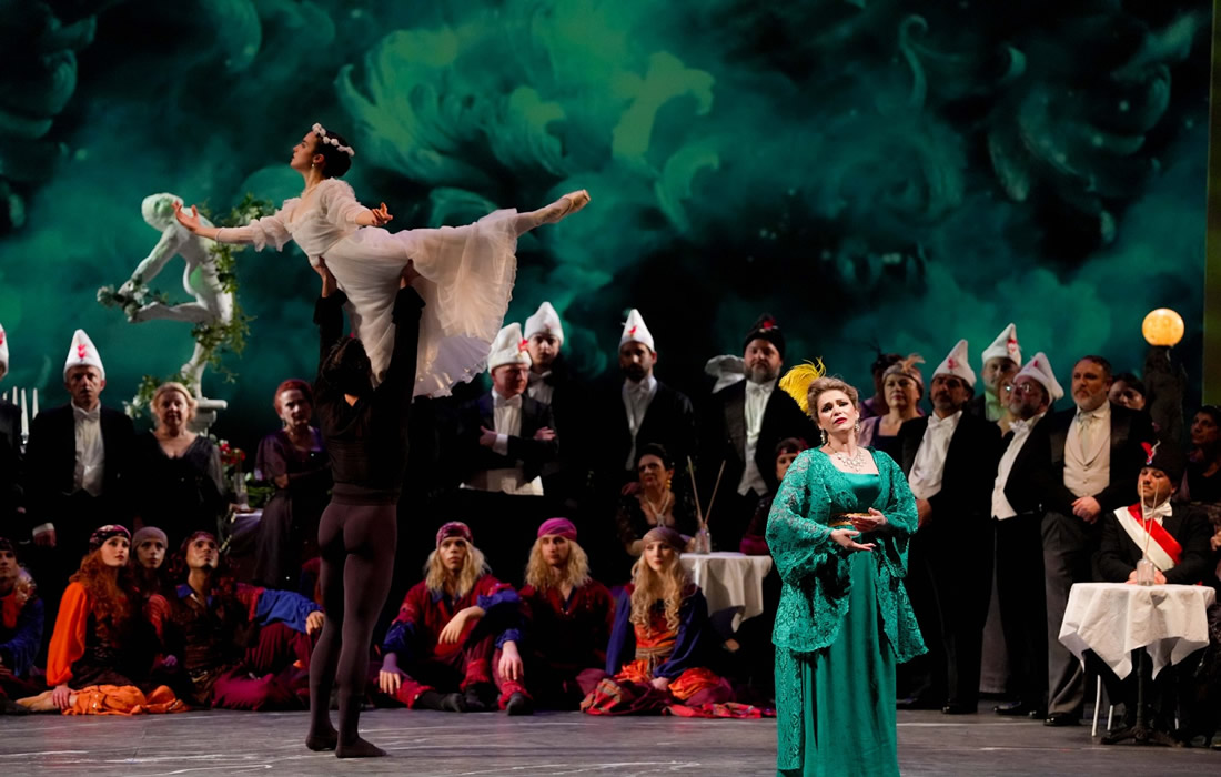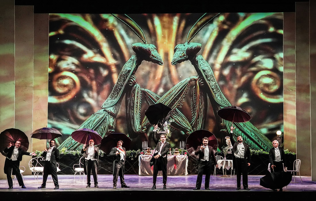 All'apertura del sipario, una pioggia torrenziale (non si capiva se grandine, bombe o droni) accoglieva l'uditorio e lo immetteva comodamente nell'atmosfera gioiosa già evidente nel titolo, arricchendosi poi di due persone che avanzavano dal parterre, vestite di stracci (si sarebbe poi scoperto, perché sono ritornati nel finale, che si trattava di Hanna Glawari e Danilo Danilowitsch post litteram), che parlavano di distribuzione del pane e di sofferenze varie, ricordando con nostalgia il vecchio mondo dell'Austria felix, che nel 1905, anno del debutto del capolavoro di Franz Lehàr, era ancora assolutamente felix. Insomma, se non era l'atmosfera che precede nel Macbeth l'aria di Macduff poco ci mancava… Dopo di ciò, come quando nel mezzo di una discussione su tragedie televisive varie irrompe la pubblicità, l'operetta finalmente cominciava, e si veniva immersi in una gaia atmosfera di frizzi, lazzi, calambour, piume di struzzo e abiti da sera che con quanto fatto prima ci stava più o meno come i cavoli a merenda, tranne per qualche, raro, infilato a forza accenno a una guerra, che nel Pontevedro, probabile Montenegro, reo soltanto di aver dato i natali a Nero Wolfe, non si capisce bene contro chi e a quale scopo potesse essere combattuta. Ma naturalmente l'accenno era alla Prima guerra Mondiale, per la quale mancavano ancora molti anni, e più in generale per lo spettro che oggi si agita a ogni piè sospinto di un eventuale terzo conflitto mondiale, che è almeno la quarta volta che viene evocato dalla guerra in Ucraina a oggi. Insomma, sfruttando non certo ad arte le parti dialogate ad libitum, il drammaturgo si sbizzarriva in ogni modo, ora virando apertamente sul comico da fescennini, ora intrufolandoci qualche sciagura, tanto per non perdere l'abitudine, ora usando termini alquanto anacronistici come default. E fin qui ancora, a parte la generale schizofrenia tra riso e piagnisteo, la liceità dell'operazione avrebbe ancora potuto reggere: se le parti ad libitum sono ad libitum, ognuno è libero di infilarci quel che più vuole, a suo rischio e pericolo. Ma il peggio di questa continua lardellazione della Vedova si è avuto nel terzo atto quando, dopo il ballo delle grisettes, il drammaturgo ha pensato bene di ergersi a musicista collaboratore, inserendo, come spiegato da Njegus “arie di baule” (scomparse dal melodramma già nell'Ottocento), nella fattispecie “Lily Kangy”, più nota per la divisa “Chi me piglia pe' francesa/chi me piglia pe' spagnola”, con tanto di mossa incorporata, seguita immediatamente dalla Barcarola presente nel quarto atto de Les comtes d'Hoffmann di Jacques Hoffenbach, quella guarda caso che fa da filo conduttore a La vita è bella di Roberto Benigni, film dall'argomento perfettamente in tono con la canzone d'avanspettacolo che l'ha preceduta.