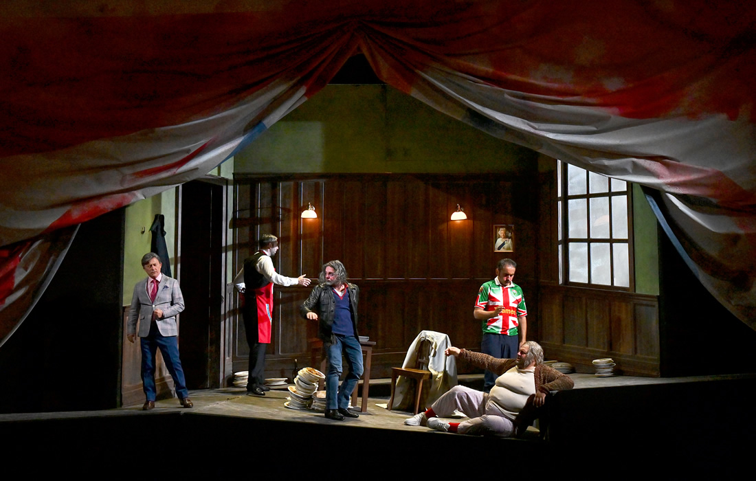 Alla riuscita dello spettacolo concorre la regia di Jacopo Spirei, con scene di Nikolaus Webern, costumi di Silvia Aymonino e luci di Giuseppe di Iorio, già presentato in prima assoluta qui al Regio di Parma nel 2017. Un Falstaff attualizzato, si diceva, ma convincente, laddove sempre più spesso le attualizzazioni sono occasioni per registi bisognosi di inscenare il proprio ego. Qui no. Attualizzare sembra voler dire per Spirei far rivivere lo spirito falstaffiano al giorno d'oggi, dimostrandone l'attualità e le ipocrisie sociali che lo circondano, vedi la relazione per convenienza che il padre di Nannetta vorrebbe per lei (nell'originale addirittura i pretendenti sono due, con l'aggiunta di Slender). È da apprezzare soprattutto il fatto che, pur attualizzando, non rinunci a mettere in scena restando coerente col libretto, talvolta con precisione millimetrica sulla parola detta (come quando le cameriere di Mrs. Ford spostano un divano). Siamo in un Regno Unito contemporaneo, e a dircelo è la grande bandiera inglese che accoglie lo spettatore sul palcoscenico entrando in teatro. La bandiera si solleva a mo' di sipario e sorprende Falstaff nella camera che affitta all'Osteria della Giarrettiera, una semplice stanza poco ammobiliata con interni in legno scuro e una pila di piatti sporchi a terra. È trasandato, si diceva: barba e capelli lunghi, non curati, qualche straccio bisunto, un portatile vecchio tipo che a un certo punto scaglia via, inservibile. I costumi delineano a colpo d'occhio stati sociali diversi, e diverse posizioni di pensiero. Ford è in completo e cravatta, da uomo d'affari; Fenton e Nannetta hanno un look più trasgressivo, da giovane “che non ci sta”, con Fenton in kilt di pelle nera e Nannetta fasciata in collant “alternativi”; ancor più malacconcio Pistola, con abiti che sembrano recuperati qua e là. Bardolfo se la cava con jeans e giubbotto di pelle nera. Le comari sono le più centrate, riflettendo coi loro abiti pastello molto english il loro status di borghesotte alle quali la stabilità economica dà loro l'estro di divertirsi, anche un po' crudelmente, a spese di un evidente spiantato come Falstaff (che poi nell' Enrico IV quest'ultimo fosse amico intimo del Principe di Galles e che quindi in qualche modo riuscisse a cavarsela sempre è un altro discorso; anche perché il Falstaff delle Merry Wives non è quello dell' Enrico IV : Harold Bloom, a proposito, relega questa commedia tra le meno riuscite di Shakespeare, al rango dei Due gentiluomini di Verona). Abiti da golf, livree da perfetti camerieri e impermeabili da ispettore Clouseau completano il variegato assetto di costumi.