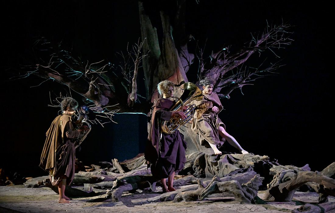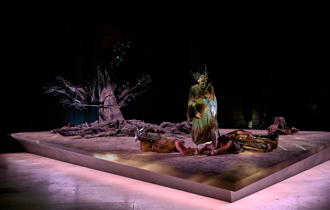 Ripercorriamo le parole della locandina, sì da analizzarle per punti alla luce della recita. È improprio definire “opera”, questo spettacolo, perlomeno nel senso corrente del termine – e sul significato dei termini bisogna pur accordarsi per capirsi: è la base del linguaggio. A ben vedere, si avvicina di più a una performance, al teatro di prosa, una prosa però musicale, musicata dall'inizio alla fine, sfruttando pervasivamente, come si diceva, sia l'elettronica, con testi e suoni campionati, sia la musica strumentale, affidata all'eufonio della Strega 2, Marina Boselli, e alla tuba della Strega 3, Fanny Meteier. Ed è proprio da ravvisare nella presenza delle tre streghe la connessione (labile a dire il vero…) con la presente edizione del Festival Verdi, che vede esplorare il legame tra Verdi e Shakespeare e che ha nelle sirocchie del Macbetto il suo punto di tangenza. L'organico, se così si può definire, si riduce a questi due ottoni (cosa che fa fare a meno della figura del direttore d'orchestra: serve però un bravo tecnico del suono, in questo caso affiancato dalla compositrice ed entrambi accanto alla consolle al fondo della sala), che per parti dello spettacolo trovano posto ai lati della scena, con leggii predisposti e cubi di legno per sgabelli, e per altre parti si muovono su di essa, partecipando fattivamente alle coreografie e in certi casi pronunciando parole addirittura nel bocchino dello strumento. Non è certo la prima volta che degli strumentisti vengono ad avere parte attiva in uno spettacolo, dalla tromba in palcoscenico che accompagna Dulcamara in avanti (e indietro); di certo, il fatto che entrino in trio con la Strega 1, alla quale comunque è riservato il ruolo più importante quqnto ad arte tersicorea, può costituire elemento di novità – uno dei tanti, sia detto. Il fatto che le due strumentiste fossero donne per poter interpretare le Streghe cade a pennello, ed è sicuramente voluto; ma ciò non potrebbe essere un fattore condizionante per le prossime eventuali repliche? A meno di non voler considerare questa come la sola e unica: in tal caso definirla “prima assoluta” perderebbe di senso. Da questo punto di vista, la splendida cornice del Teatro Farnese di Parma, costruito tutto in legno nella prima metà del Seicento, sulla scorta dell'Olimpico di Vicenza, e utilizzato in totale nove volte prima della sua distruzione durante la seconda guerra mondiale, dovrebbe far scuola: spettacoli che, pur nella loro originalità costituiscano un unicum e non possano essere ripresi in seguito risultano un po' fini a se stessi – a meno di non trovare altre due strumentiste con sufficiente senso ginnico e attoriale da replicare quanto fatto, peraltro benissimo, da Boselli e Meteier. In ogni caso, il loro contributo più importante è sicuramente però quello musicale, costituendo una trama sonora quasi costante alla rappresentazione, talvolta entrando in duo con la voce, talvolta sviluppando autonomamente frammenti di “temi” – che poi sono più che altro spunti, dotati però di una loro pregnanza, soprattutto emozionale, frasi angoscianti o il pulsare del cuore umano (ricorda certe percussioni della scena del Commendatore del Don Giovanni …) e che col loro riproporsi, quasi temi reminiscenza, fanno da collante alla recita –, talaltra fornendo una sorta di sottofondo nello stile dei canti tibetani. A questi suoni si sovrappongono quelli campionati, con un effetto di sterofonia dato dalla doppia sorgente.
