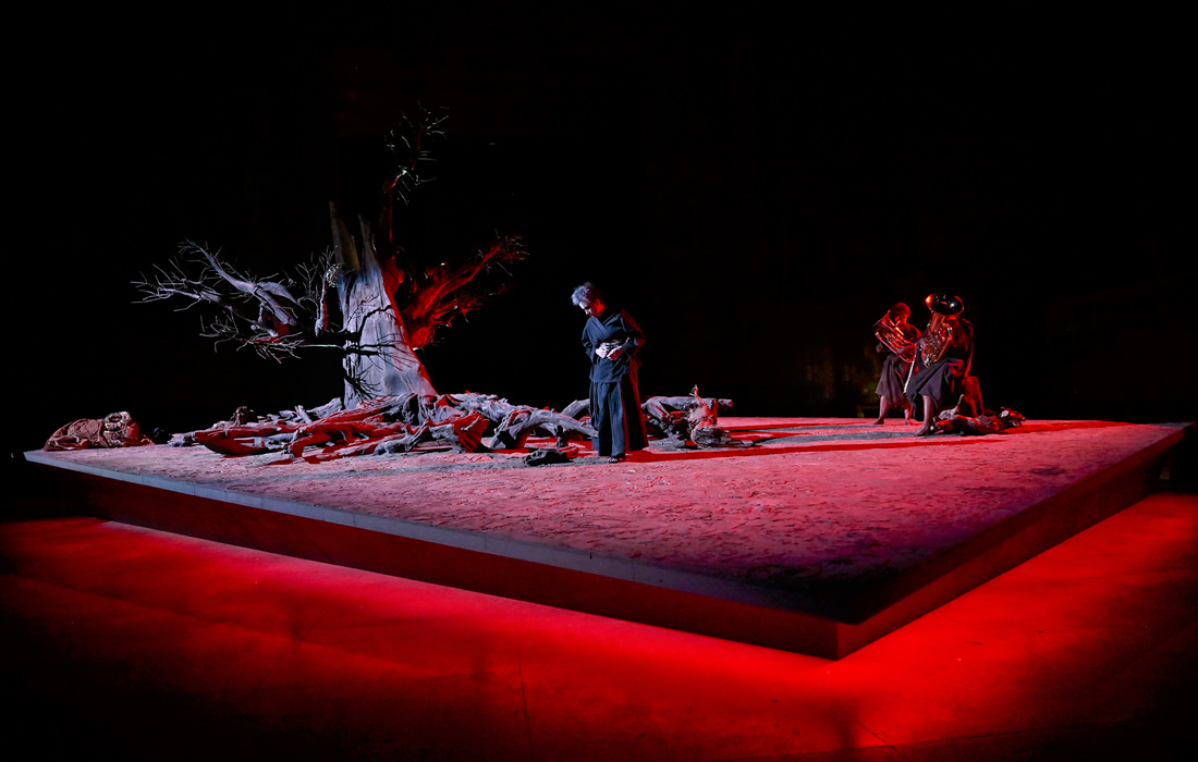 Resi cadaverici ed emaciati dal trucco, con nere occhiaie segno di innumeri notti insonni, entrambi vestiti di scuro, in una sorta di kimono da aikido fissato in vita da una cintura metallica argentea, coperti da un mantello che pare ricavato da pellicce di animali cucite assieme, Madre e Figlio – a che nomarli? è inutile! – si muovono su una piattaforma leggermente inclinata verso il pubblico e che lambisce quasi la prima fila di sedie: scena unica, perennemente nell'oscurità – tutto il Farnese è tenuto al buio, fuor che i riflettori puntati sulla piattaforma, cosa che contribuisce non poco a un'esperienza immersiva, complice un rombo sordo, vagamente inquietante, che accoglie lo spettatore in attesa dell'inizio –, con un albero nodoso e secco al centro e un piccolo ceppo sulla destra (di più difficile decifrazione è il grosso pezzo di specchio che compare verso la fine, prima invisibile, poi sollevato dal pavimento della scena). L'arrivo dei due è dal fondo della sala, sorta di Anchise ed Enea in fuga da Troia in fiamme. E in effetti si ha questa idea di un mondo post-apocalittico, da cui i due stiano fuggendo: il riferimento a La strada di McCarthy pare evidente in questo cammino senza meta di due esseri senza nome in un ambiente straniante e desolato, uniti da un legame di sangue. Ma in questo caso la meta c'è, sia come luogo, sia come fine. Si allude a un rituale messo in atto da generazioni, dacché si deduce che il mondo è in quelle condizioni da parecchio.