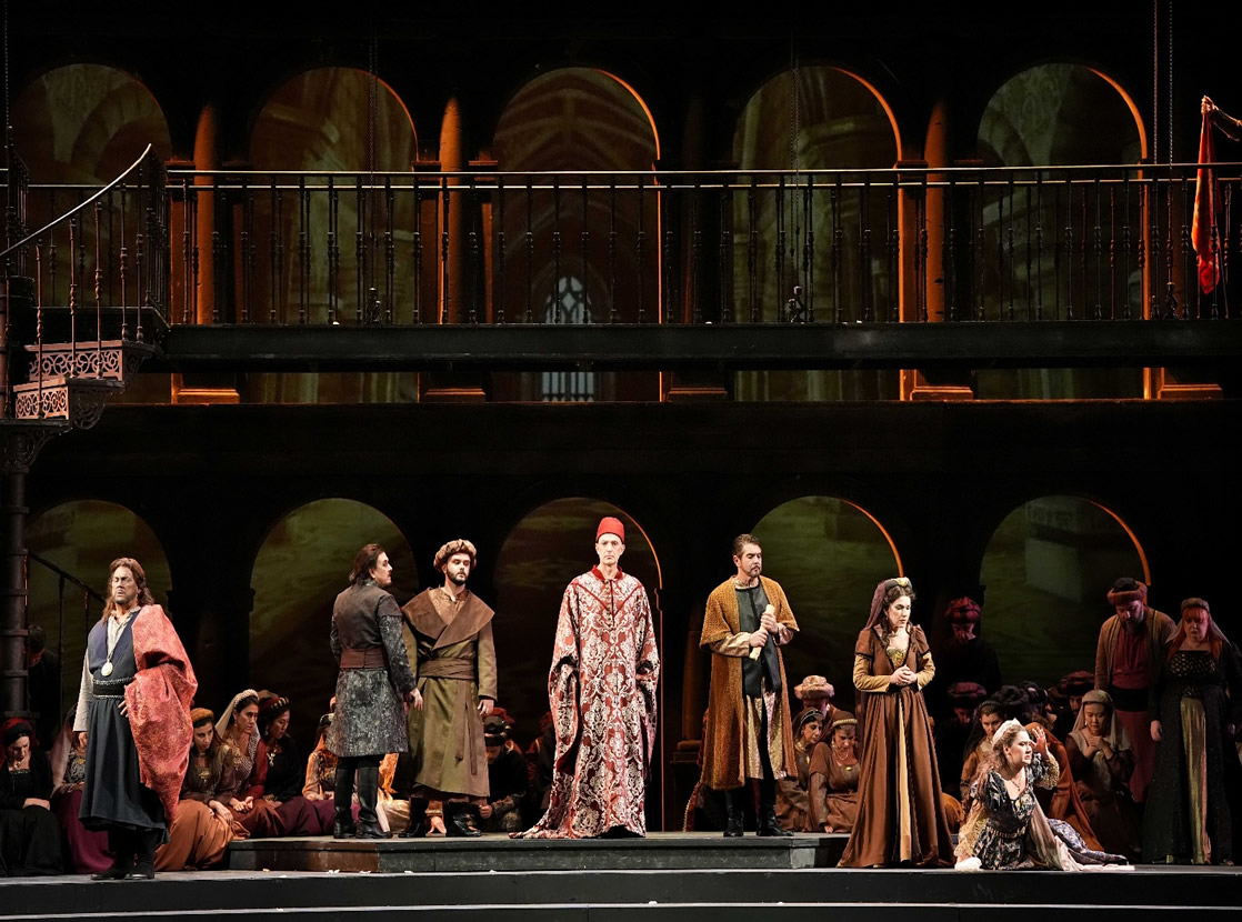 Ha avuto poi inizio lo spettacolo, che riprendeva una produzione dell'Opéra de Monte-Carlo, su allestimento dell'Opera nazionale di Tbilisi, con la regia ripresa da Zaza Agladze, i costumi di Ester Martin Garrido, le scene di Bruno de Lavenére e le luci di Antonio Alario: si tratta di una mise en scéne che, seppur abbastanza tradizionale nell'impianto generale, riusciva a sfruttare appieno le risorse moderne, slargando e dilatando la scena fissa, un grande spazio vuoto inquadrato da una balconata che su un lato del palcoscenico terminava in una scala a chiocciola di hitchcockiana memoria, metafora forse dell'inesorabile discesa agli inferi che attende Otello, sia con un sapiente uso del velatino, sul quale venivano proiettati i fulmini e le nubi della tempesta del primo atto, lungo i quali a tratti passava un truce volto moresco – e qui si potrebbe rammentare l'iconica scena di The Passion, dove Satana trascorre tra la folla che segue l'ascesa al Golgota di Cristo. I video di Étienne Guiol e Arnaud Pottier donavano ulteriore profondità al palcoscenico, dinamicizzando la scena con suggestive immagini ora di un mare in tempesta, ora del lento infrangersi delle onde sulla spiaggia, ora di un sontuoso pavimento rinascimentale, ora di una notte cupa nel quarto atto. Le coreografie di Lino Privitera, essenziali e asciutte ma di grande gusto, affidate a ottimi danzatori, hanno ulteriormente impreziosito uno spettacolo che, pur nella ricchezza dei costumi, e nella dinamicità visiva, è riuscito in quello che dovrebbe essere il fine ultimo di ogni regia d'opera: costruire uno spettacolo elegante e gradevole senza distrarre continuamente lo spettatore dell'aspetto musicale e drammaturgico, vezzo che purtroppo affligge troppi blasonati registi che fanno di tutto per apparire i veri creatori dell'opera, a tutto discapito del musicista.
