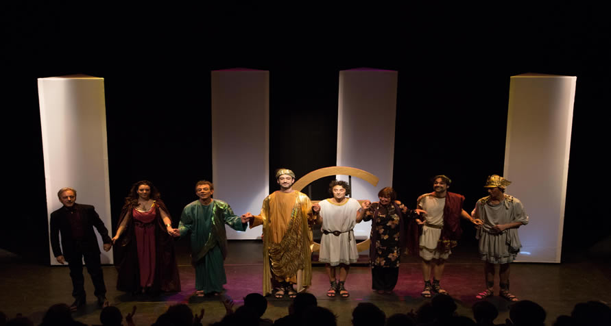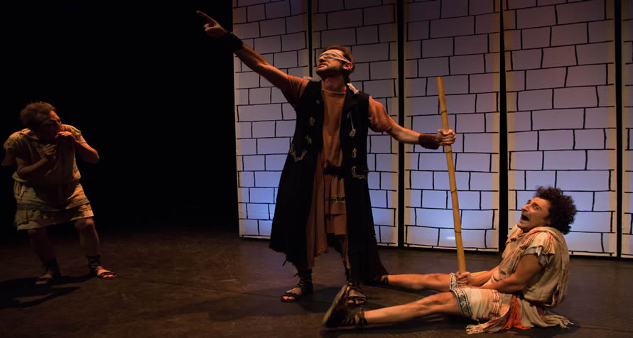 che la compagnia Gli Stravaganti ha interpretato con grande professionalità, ma al tempo stesso con garbata ironia, evidenziando senza caricare le tante battute polemiche che potrebbero tranquillamente affibbiarsi ai nostri politici, manifestando al tempo stesso quella pura gioia di fare teatro che tante e tante volte abbiamo notato in questi valenti attori. Unica concessione esplicita alla modernità, un grande Euro portato in scena alla fine della commedia, ostensiva chiave di lettura in favore di un ideale (ma non troppo) gemellaggio tra l'antico e il moderno, almeno quando si parla di ricchezze ingiustamente acquisite e ancor più ingiustamente mantenute ed accresciute. Antonio Caruso, nei panni di Cremilo, il contadino che incontra Pluto cieco e lo conduce al tempio di Esculapio per fargli riavere la vista e ridistribuire così equamente la ricchezza, premiando gli onesti e affamando i disonesti, ha interpretato con verve brillante il suo personaggio, prestando la sua ottima mimica ai numerosi duetti con Pluto, interpretato da Giuseppe Bisicchia con grande sicurezza scenica, ma soprattutto con Adriano Aiello, il servo Carione, vera rivelazione dello spettacolo: dotato di un talento notevolissimo, si è rivelato un perfetto caratterista, capace da solo di infondere brio, movimento ed ilarità rutilante a tutta la commedia. A suo totale agio nel ruolo comico, ha fatto volta a volta da spalla a Caruso e a Bisicchia, emergendo poi come protagonista quando gli effetti della riacquistata vista di Pluto si manifestavano nella totale trasformazione dei poveri in ricchi, di un ricco politicante in miserabile, e causavano addirittura l'arrivo di Ermete incaricato da Zeus di rimettere le cose a posto: qui Aiello da interagito con maestria, strappando sincere risate al folto pubblico intervenuto, ma senza mai ricorrere ad artifici da avanspettacolo che avrebbero ridotto il lavoro a triviale buffonata: naturale e sciolto, non ha allentato mai il controllo della recitazione, offrendo una figura di servo ilare sì, ma dietro il quale si celava una garbata ironia che gli consentiva di trattenersi sempre al di qua della grassa risata, infondendo al suo umorismo una vena di amarezza che a tratti si faceva palpabile.