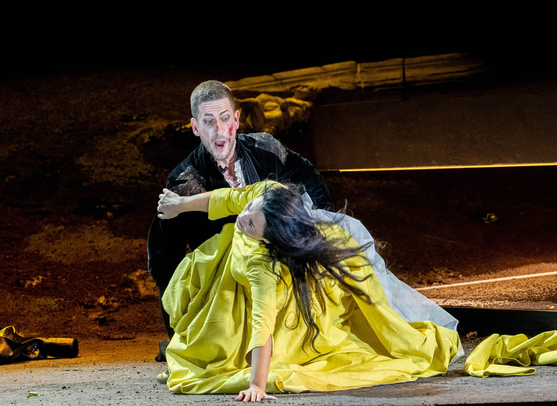 Ci si sente quasi in dovere di ringraziare per una regia tanto lambiccata e inutilmente pretestuosa come quella di Andrea Bernard, che ha l'unico vantaggio di essere così poco interessante da far preferire una fruizione dello spettacolo a occhi chiusi, sì da concentrarsi meglio sulle voci. Le indicazioni librettistiche sono quasi del tutto rigettate, conservando solo quelle ineludibili per lo svolgimento della trama. Anche l'ambientazione è straniante, avulsa da qualsivoglia contestualizzazione storica o geografica. Le scene di Alberto Beltrame prevedono un tenebroso palcoscenico quasi totalmente spoglio, con un pannello rettangolare mobile a fare ora da palazzo dei Borgia con inciso il cognome, dal quale Gennaro staccherà la lettera B, ora da tetto per una zona protetta dalla violenza dell'azione, sotto il quale, in un primo momento Lucrezia, durante il Preludio, culla e allatta un bambino (pupazzo), prendendolo da una culla bianca – il bambino le verrà poi sottratto in un momento di distrazione, sempre durante il Preludio, da un figurante in veste di Papa, evidentemente Alessandro VI, padre di Lucrezia (siglando così l'antefatto e spiegando il perché della vita senza madre di Gennaro), e la culla verrà rotta in tanti pezzi, simbolo della maternità spezzata – e dove, in un secondo momento, durante Anch'io provai le tenere di Gennaro, una controfigura di Lucrezia culla un bambino invisibile. Esclusi due tavoli per il ricevimento dalla principessa Negroni e pochi altri oggetti di scena (le immancabili coppe per l'avvelenamento), il palcoscenico è desolatamente vuoto. Il tema dell'inconscio la fa da padrone, del doppio come manifestazione dei pensieri inconfessati, la madre in candida veste per Lucrezia, un uomo in gonnellino da Tarzan, bruciato e annerito come un carbonaio per Gennaro, che compare nei momenti topici dell'opera, cammina lentamente un passo avanti all'altro (movimenti scenici a cura di Marta Negrini) e torna dietro le quinte. La trovata non è malvagia, ma la realizzazione lascia a desiderare, e, detto francamente, in un contesto di innovazione, bella o brutta che sia, sa di già visto. Ancora più incomprensibile è il motivo delle tre scritte Inferno-Purgatorio-Paradiso che appaiono nei sopratitoli verso metà circa del Prologo, del primo e del secondo atto. Neanche i costumi, a firma di Elena Beccaro, paiono obbedire a una qualche coerenza, con tutti Don Alfonso in trench di pelle nero e Lucrezia dapprima in jeans neri e camicia bianca, poi in stivali neri e impermeabile giallo. D'accordo che in natura giallo e nero sono i colori degli insetti velenosi, e qui di veleno si fa uso; però… Christian Speranza