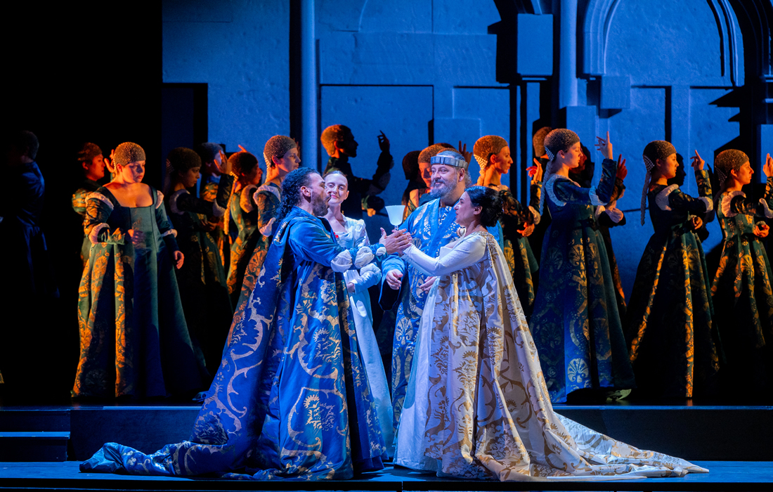 Ci pensa il Donizetti Opera Festival 2025 a inscenare la «Prima rappresentazione secondo la volontà del compositore»: un tassello non da poco nella scoperta ancora in fieri del lascito donizettiano. A dirigere questa nuova Cornaro un esperto del settore, Riccardo Frizza, da quest'anno nuovo direttore artistico e musicale del Festival, che qui, alla testa dell'Orchestra Donizetti Opera, fornisce con mano sicura e con polso più che fermo una lettura da cui emerge la tracotante sanguignità della musica. Ma non solo. Fri zza si riconferma un direttore di classe per questo repertorio; concertati incalzanti, densi, coesi; un finale davvero esplosivo e trascinante, dalla corrusca timbrica orchestrale, per quanto senza guizzi di straripante personalità; duetti equilibrati per dinamiche e agogiche, arie e cantabili accarezzati e cullati nelle loro frasi da morbidi cortei sonori. Certo, sarebbe stato corretto porre gli intervalli tra un atto e l'altro, anziché metterne uno dopo Prologo e metà primo atto (dopo il duetto Gerardo-Lusignano della scena III, per l'esattezza), e ascoltare per intero il Preludio, anziché doversi accontentare di una sua versione mutila, troncata dal sopravvenire di una voce registrata che declama: «Mio marito è molto malato», la stessa frase che si può leggere, come altre che seguono durante la recita, proiettata sulla scena in un font che parrebbe lo stesso dei programmi di sala della Fenice (riferimento voluto, dato il soggetto e la recente querelle Venezi -ana?). Tra l'altro: il ricorso alle scritte pare quasi una didascalica excusatio non petita per una regia che si sa che sarebbe stata difficile (Micheli che vuol fare il Michieletto, con minor estro e minor perversione).