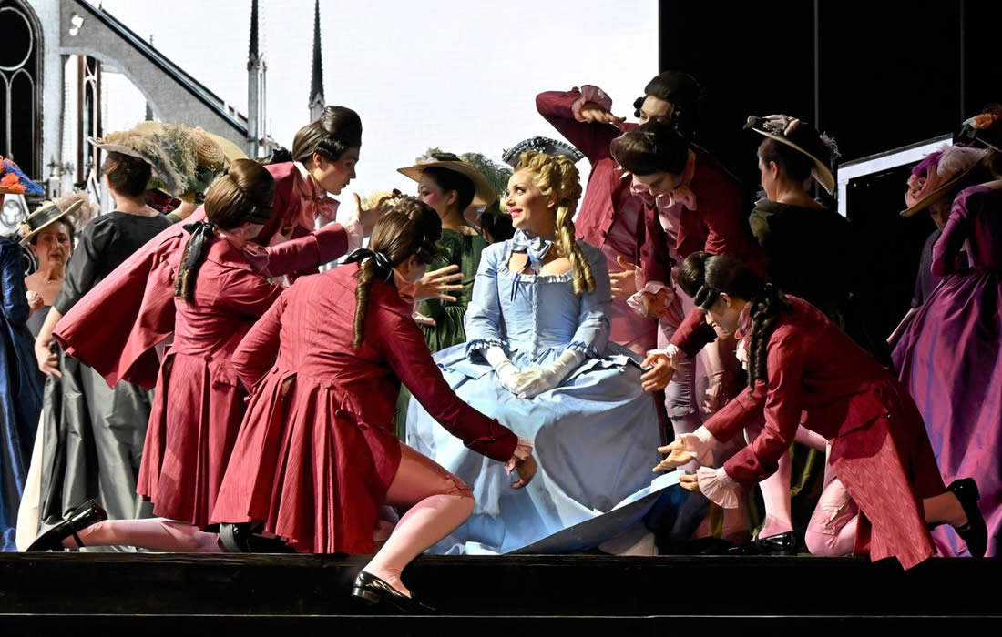 Manon Lescaut mancava in questo Teatro dal dicembre del 2005. Per la sua ripresa si è optato per l'allestimento presentato al Festival di Torre del Lago nel 2024, debitamente adattato per la piazza parmigiana. Regia, scene, costumi e luci sono a cura di Massimo Pizzi Gasparon Contarini. L'idea sembra essere quella di restare fedeli al libretto e alla sceneggiatura, innestando però la tecnologia a servizio dello spettacolo. E potrebbe anche funzionare, al netto di scelte ben poco e in alcuni casi punto condivisibili sulla grafica del progetto. Tutto è improntato a una violenza di colori pari solo alla violenza delle passioni portate in scena: i costumi sono sì adeguati al Settecento, ma soprattutto quelli delle comparse e di alcuni comprimari sgargianti, macchie di colore fin troppo vivide. Non da meno è la fontana marmorea che campeggia al centro della scena ad apertura di sipario, bianchissima e vaporosa come panna montata, sul lato destro della cattedrale di Amiens riprodotta, col cielo azzurro intenso, sul ledwall al fondo. «Il ciel s'infosca» verso la fine dell'atto, la fontana ruota diventando il letto di Manon e, senza intervallo, senza chiusura di sipario, coi tavolini laterali che francamente sembrano quelli dell'Ikea rimossi a mano dai tecnici di palcoscenico, ci troviamo nel palazzo di Geronte, opulente di marmi anche qui d'un bianco-grigio fin troppo sgargiante. Significativamente, il cielo torna ad adombrarsi di nuvole alla ricomparsa di Des Grieux, come a dire che le cose stanno per prendere una brutta piega. L'intervallo arriva a fine secondo atto, e al rientro ci si aspetterebbe l'Intermezzo. No: si va lisci col terzo, l'Intermezzo venendo spostato all'inizio del quarto. Ci torniamo. Prima, vediamo come è reso il porto di Le Havre: gabbie da animali ai lati, molto più moderne per l'epoca come i tavolini di cui sopra, racchiudono le prostitute, che con una certa monotonia devono, tutte spettinate e conciate come certi personaggi di Helena Bonham Carter, provocare il Sergente con moine o gesti osceni – una certa rigidità d'impostazione nel far muovere i personaggi è del resto riscontrabile anche negli altri atti: comparse quasi sempre speculari, gestualità poco coerenti, come il palleggiare dei gioielli da parte di Manon al second'atto, mentre tutto attorno a lei è fretta e frenesia. Dall'orizzonte del mare sul ledwall giunge, ingrandendosi sempre più e infine attraccando al pontile, il vascello su cui Des Grieux, Manon e le altre ragazze salperanno: una grafica che ha portato più d'un commentatore a evocare realtà videoludiche, con più o meno pertinenza, assieme al deserto della Louisiana reso con vivide, abbacinanti campiture bruno-arancioni, sempre grazie al ledwall. L'idea, ripeto, potrebbe anche funzionare, ma tutta questa stucchevole artificiosità di colori e in alcuni casi di movimento porta alla lunga più a un estraniamento che non a un'immedesimazione, sortendo quindi l'effetto opposto di un, si diceva, pur lodevole proposito.