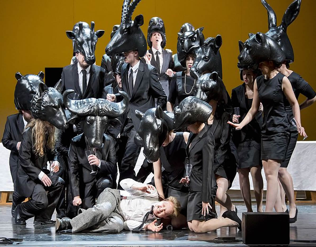 Convincente proposta, che imprime nei settanta minuti di durata un'esagerata trasformazione musicale e molti riferimenti odierni, ma forse è il finale, non indicato, che porta il pubblico alla riflessione. Il regista Dominique Mentha realizza uno spettacolo che di primo impatto appare onirico, stilizzato, e lieve, anche con l'ausilio delle scene essenziali e ben realizzate da Ingrid Erb e Werner Hutterli. Ma durante la corta esecuzione ci si accorge della sottile e cruda chiave di lettura, che volutamente va in crescendo, e fa notare la violenza della società sul singolo, il distaccato. La collettività ha sempre la meglio, e soprattutto più potere. Ingrid Erb è anche autrice di bellissimi costumi moderni, e in particolare non si possono non menzionare le maschere a forma di animale, dal titolo dell'opera. Efficaci e variegate le luci di Norbert Chmel.