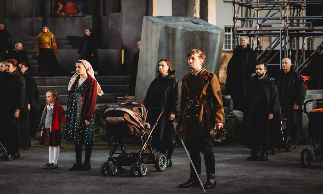 Schiller, scrivendo la sua Jungfrau von Orleans, volle definirla «tragedia romantica», mentre Verdi, ponendola in musica, preferì parlare di «dramma lirico». Per Barbora Horáková – praghese naturalizzata svizzera, ignota in Italia ma nome di punta tra i registi operistici internazionali di ultima generazione – comunque non ci sono dubbi: la Giovanna d'Arco verdiana è un Kriegsstück, “un pezzo teatrale di guerra”, e non solo perché il compositore di Busseto, seguendo le orme schilleriane, preferì far morire Giovanna sul campo di battaglia anziché sul rogo. Dunque, la sua messinscena nel cortile della Cattedrale di San Gallo (il teatro della città elvetica affida il titolo operistico estivo agli spazi aperti del Klosterhof) è una di quelle che, come si suol dire, prendono posizione: l'affresco bellico fagocita l'idillio pastorale; il barbarico prevale sul catartico; la ferocia dell'odio, che nell'opera di Verdi muove le masse, lascia ben poco spazio a quel disperato bisogno d'amore che invece permea, in modo differente, i tre protagonisti. E il continuo trascolorare tra celestialità bucoliche e oscurità dell'animo qui cede il passo a un pedale di tenebre fitte. Siamo insomma agli antipodi d'un celebre scritto di Rodolfo Celletti («Quest'opera non è, salvo qualche passo, focosa, bellicosa, sanguigna. Carlo, Giacomo, Giovanna […] sono tre figure dolenti, allucinate trasognate», in Il teatro d'opera in disco, 1976), ma non è detto che un critico abbia antenne più sensibili di un regista. Tanto più quando quest'ultimo, ed è il caso della Horáková, ha alle spalle una solida formazione musicale. Come sempre, ciò che conta è l'onestà intellettuale dell'impianto e la coerenza con cui viene sviluppato: lo spettacolo risponde a entrambi i requisiti, risultando appagante – grazie pure ai costumi diacronici, dal Medioevo al nostro presente, di Annemarie Bulla – tanto sul versante estetico quanto su quello concettuale. Sotto il primo aspetto a essere vincente è la formula in sé della messinscena di fronte alla Cattedrale, la cui facciata interagisce con il resto della scenografia, in un'opera a soggetto religioso (oltre a Giovanna d'Arco negli ultimi anni sono stati allestiti Notre Dame di Schmidt e Stiffelio). E la vastità del palcoscenico, che consente di raccontare tanti episodi paralleli a fianco della vicenda che di momento in momento va svolgendosi, è tutt'altro che un fattore dispersivo. Anzi, paradossalmente, nel dipanare queste narrazioni accessorie tanto più la regista mette in luce la caratteristica dell'opera, che è quello di essere, dall'inizio alla fine, uno scontro a tre voci, dove per i comprimari non c'è spazio: Talbot e Delil, in fondo, sono soltanto un'appendice solistica del coro degli inglesi e dei francesi.