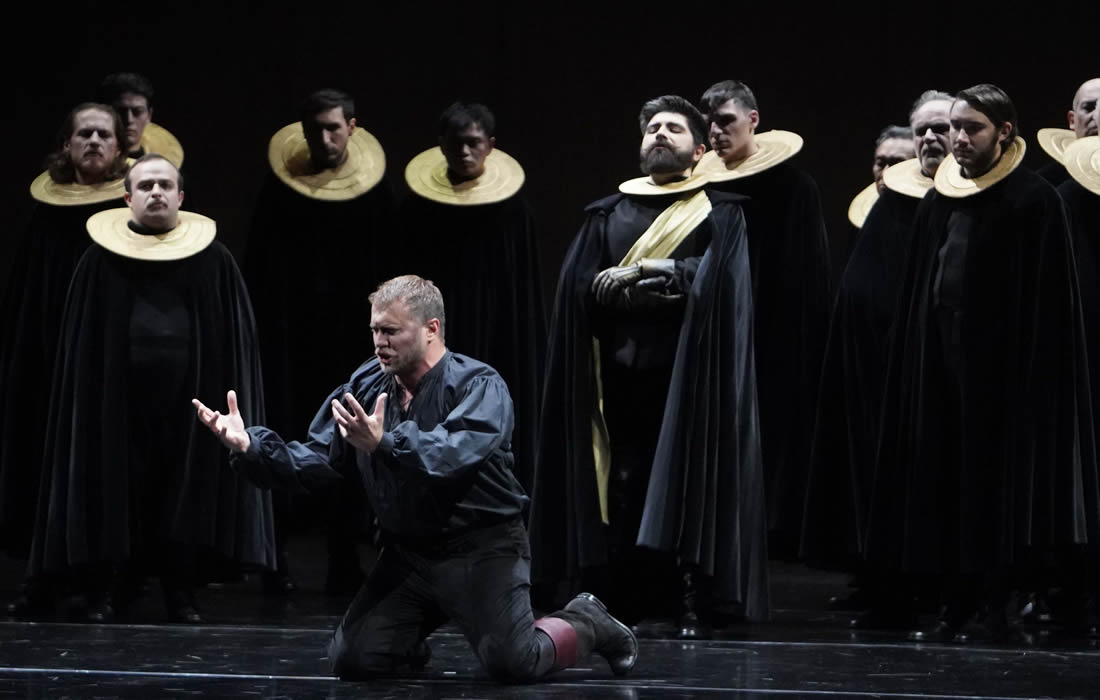 E partiamo quindi proprio dal Rigoletto andato in scena mercoledì 5 novembre 2025, prima delle tre seconde date del progetto. Come si diceva, cast, regia e direzione sono (quasi) gli stessi per i tre titoli. La regia è affidata a Roberto Catalano, che si avvale delle scene di Mariana Moreira, i costumi di Veronica Pattuelli, le luci di Silvia Vacca e le coreografie di Marco Caudera. L'ambientazione scelta da Catalano non ricalca pedissequamente le indicazioni librettistiche, ma se ne distacca con intelligenza, mantenendo aderenza allo spirito del libretto e proiettando la realtà drammaturgica in una dimensione sospesa, quasi idealizzata, con riferimenti sincretici a più epoche storiche, suggerite dai dettagli in scena, che di fatto non coincidono in pieno con nessuna epoca storica. Rigoletto, con l'immancabile gobba (che poi… immancabile… in alcuni Rigoletti manca eccome!), veste la giubba rossa del giullare, ma se ne libera nei momenti in cui la sua umanità emerge senza schermi, quando viene maledetto o poco prima del Cortigiani, quando la scaglia a terra affinché il padre oltraggiato e l'uomo ferito possano essere autentici. La gorgiera bianca e l'abito nero dei cortigiani fanno molto Seicento spagnolo o fiammingo – avete presente la Lezione di anatomia di Rembrandt? –, ma i lampadari elettrici che pendono sopra il salone del Duca contrastano in modo evidente, così come il bianco letto in ferro battuto, stile Ottocento o primo Novecento, di Gilda, anch'essa in un semplice abito bianco, connesso ovviamente all'idea di purezza. E bianco avorio sono pure le lesene e gli archi del palazzo del Duca, una sobria architettura rinascimentale classicheggiante. Tabarri, ferraioli e cappotti caratterizzano poi Rigoletto non in abiti da lavoro, il Duca, Monterone e Sparafucile. Più appariscente l'abito rosso cupo di Maddalena, più sobrio quello scuro di Giovanna.