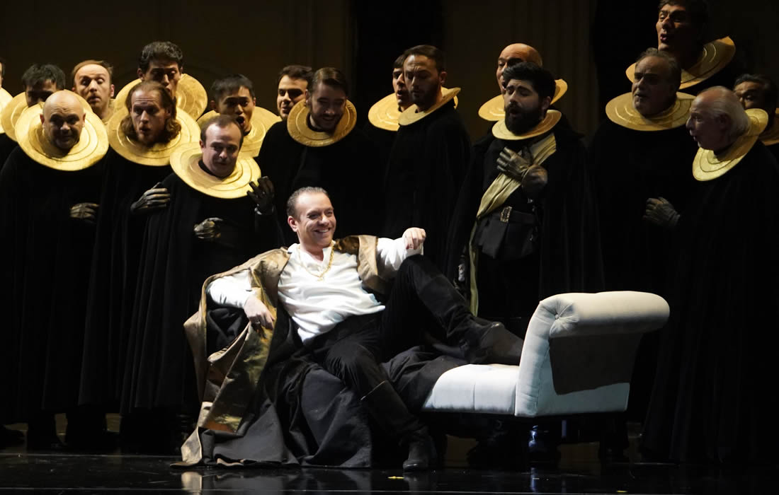 Adolfo Corrado si dimostra un dignitoso Sparafucile, dal timbro non particolarmente scuro e dall'affondo al grave non particolarmente pronunciato, ma che disimpegna bene il ruolo in grazia anche di un coinvolgimento scenico credibile. Similia possono dirsi per la Maddalena di Irene Savignano, voce rotonda e completa, un po' leggera ma in grado di tener testa al suo spartito, rendendolo efficacemente sia a livello canoro, sia recitativo. Timbro chiaro, voce lucida e presente, buon volume e facilità in acuto invece per la Giovanna di Ester Ferraro, che stupisce per queste caratteristiche dato il tipo vocale. Quanta strada ha fatto Omar Cepparolli da quando lo vidi debuttare come Don Pasquale al Carlo Felice di Genova nel 2023! Qui lo ritrovo come un buon Monterone, forse un po' chiaro per il ruolo e dal volume un poco insufficiente per colui che dovrebbe impersonare il Commendatore della situazione, ma dotato di voce squillante e di bella dizione, che lo rende più “parlante” di altri Monteroni in circolazione, e di sicuro incisivo nelle sue invettive. Un ruolo che può dire di aver ricoperto, assieme al Dottor Malatesta di quella produzione, qui convertito in un altrettanto valido Marullo: Nicola Zambon. Simone Fenotti come Borsa, Davide Maria Sabatino come Conte di Ceprano, Lorenzo Sivelli come Usciere e Giulia Alletto nel doppio ruolo del Paggio e della Contessa di Ceprano completano il valido comprimariato.