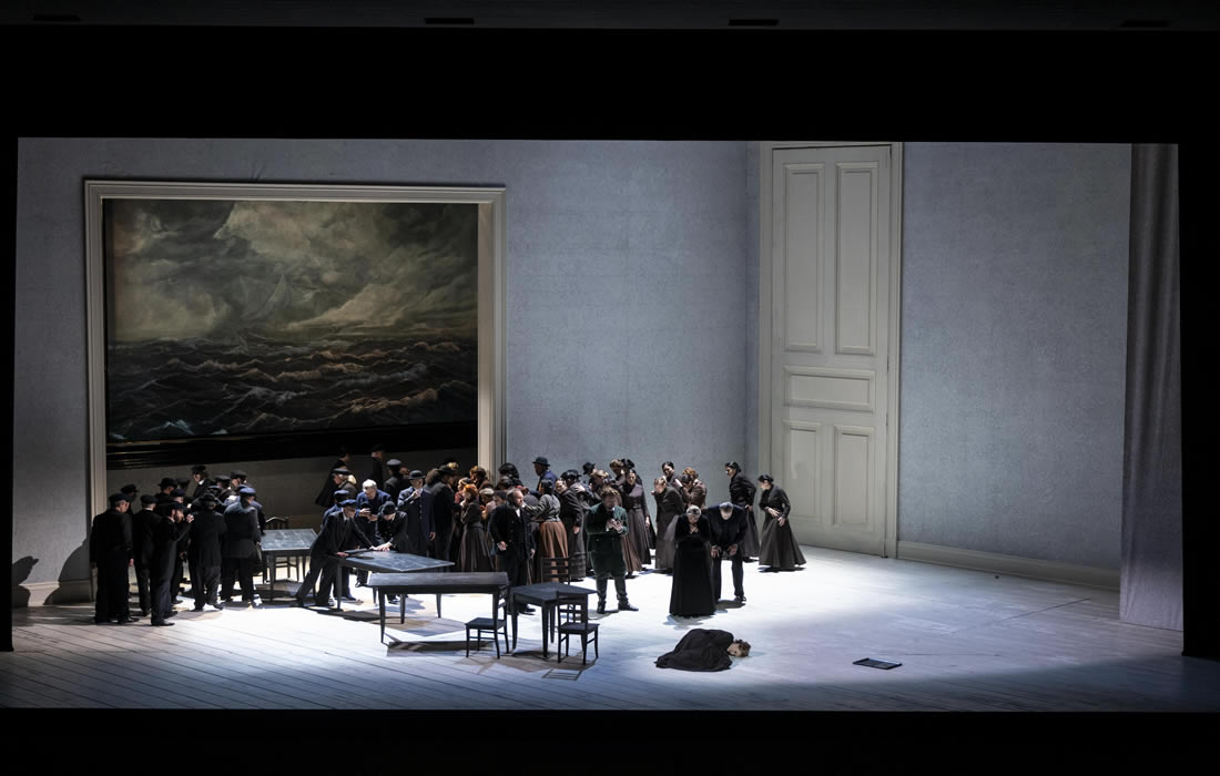 La direzione è affidata a Nathalie Stutzmann, già ospite del Regio in occasione di un concerto nel novembre scorso. La sua è una lettura interrogativa. Chi di vecchia data ha ancora nelle orecchie la lezione di Noseda, che qui al Regio ha diretto l'Holländer nel 2012, peraltro con lo stesso allestimento, ricorderà le vampe luciferine del coro degli spettri, il piglio febbrile, sulfureo del suo gesto. Dodici anni dopo, Stutzmann ribalta questa visione imprimendo a orchestra, coro e solisti un passo molto più composto, molto meno drammatico, meno impetuoso. Meno tachicardico. E non parlo delle agogiche, più lente di quelle nosediane ma bene o male tradizionali – con vistosi slargamenti però nella ballata di Senta o nel coro Steuermann! Lass die Wacht!, iperscandito nelle crome e nelle semiminime accentate del suo 2/4, sottolineate queste ultime dal calpestio marcato dei marinai (volontà di regia: ché già era successo nel 2012). Dovremmo chiamare in causa il James Levine del Met, per avere un paragone. E se l'impeto e il dramma passano in secondo piano, è lecito domandarsi perché. Questa è la partitura di un trentenne che voleva conquistare il mondo, che si era appena lasciato alle spalle le polverose trame storiche del Rienzi e le rigide regole del grand opéra per volgersi al futuro della forma, certo qui ancora imparentata coi concetti di arie, scene e duetti ma in ogni caso avviata verso qualcosa di diverso. In qualche modo deve essere diretta un po' sfrontatamente. Non si comprende quindi questo freno a mano tirato sull'ardore, sull'eccitazione, sull'euforia, con benevole concessioni all'eliofono, cui si dà insolito sfogo. Una ragione potrebbe essere quella di adeguare volume e passo al cast, così facilitandolo e favorendo una concertazione equanime tra palco e golfo mistico; anche così, comunque, alcuni passaggi rimangono coperti dall'orchestra. Un'altra potrebbe essere quella di conformarsi alla visione registica, filtrata da una sovralettura che sublima e trasfigura (o solo sfigura…) l'originale wagneriano, e che quindi necessita di una visione orchestrale diversa da quella correntemente adottata. Willy Decker, concependo questo allestimento nel 2000 per l'Opéra National de Paris, qui ripreso da Riccardo Fracchia, rigetta quasi per intero le indicazioni librettistiche di Wagner e propone una scena unica, a cura di Wolfgang Gussmann: un interno, leggermente inclinato verso la platea e sghembo, a tinte cilestrine e con una grande porta bianca sulla destra. Una scena minimalista, che ricorre soltanto a un baule, a qualche coperta per i marinai sonnecchianti e a qualche tavolo di legno. La dimensione equorea è più allusa che evocata: basta un dipinto di onde tempestose, in mezzo alle quali comparirà alla fine un vascello dalle vele bianche, simbolo di redenzione. L'epopea odeporica di questo novello ebreo errante, di questo «Pellegrino sul mare», per dirla con Lagerkvist, è compressa in questa stanza, resa asettica dalla scelta dei colori, così chiari e “puliti”, e dalle luci di Hans Tölstede, qui riprese da Vladi Spigarolo. Addirittura claustrofobica, nonostante occupi l'intero palcoscenico. Claustrofobica sicuramente per Senta, che vive un dramma tutto interiore, in una realtà dalla quale sembra estranea, e dove anche quando muore (tra l'altro pugnalandosi col coltello di Erik, ma ci arriveremo), rimane illacrimata e sola, con Erik che scuote la testa, come a dire ma guarda questa squinternata. Il famoso ritratto dell'Olandese non è mai appeso, ma è sempre tra le sue mani, o sul suo petto, segno di questa interiorizzazione, quasi un meccanismo di difesa da parte di una psiche che sentendosi incompresa non esterna nulla, dove tutto è troppo “educato” e lindo, troppo Biedermeier, dove gli arcolai sono sostituiti da ago e filo nel rammendo di un largo lenzuolo bianco, reso esplicito dai costumi borghesi, dello stesso Gussmann, che visivamente pare rifarsi alle solitudini di Edward Hopper e psicologicamente a certo Ibsen o Cechov, e che chiama in causa la tanto abusata incomunicabilità nell'assenza di contatto tra i personaggi. E che, aggiungo, musicalmente trova il suo trait d'union nella direzione addomesticata di Stutzmann (se così fosse, saremmo di fronte, o a una fortissima compenetrazione di regia e direzione, o al condizionamento di una da parte dell'altra…). In questo ambiente chiuso, con la porta che simboleggerebbe l'apertura a tutto ciò che di ignoto e di potenzialmente pericoloso c'è fuori, da cui entrano potrei dire solo mentalmente l'Olandese e la sua nave, in forma di tre gomene fissate di traverso lungo il palcoscenico o grazie alle vele rosse che si intravedono sullo sfondo, il dramma privato e segreto di Senta non trova altro sbocco che la morte, ma senza la spettacolarizzazione che la caduta da una rupe comporterebbe. Forse un regista cinematografico avrebbe optato per il taglio ai polsi, un dramma della solitudine, dell'incomprensione, dell'inconveniente di essere troppo sensibili, utopici, evanescenti...